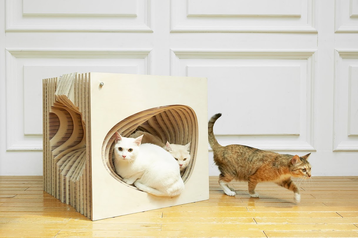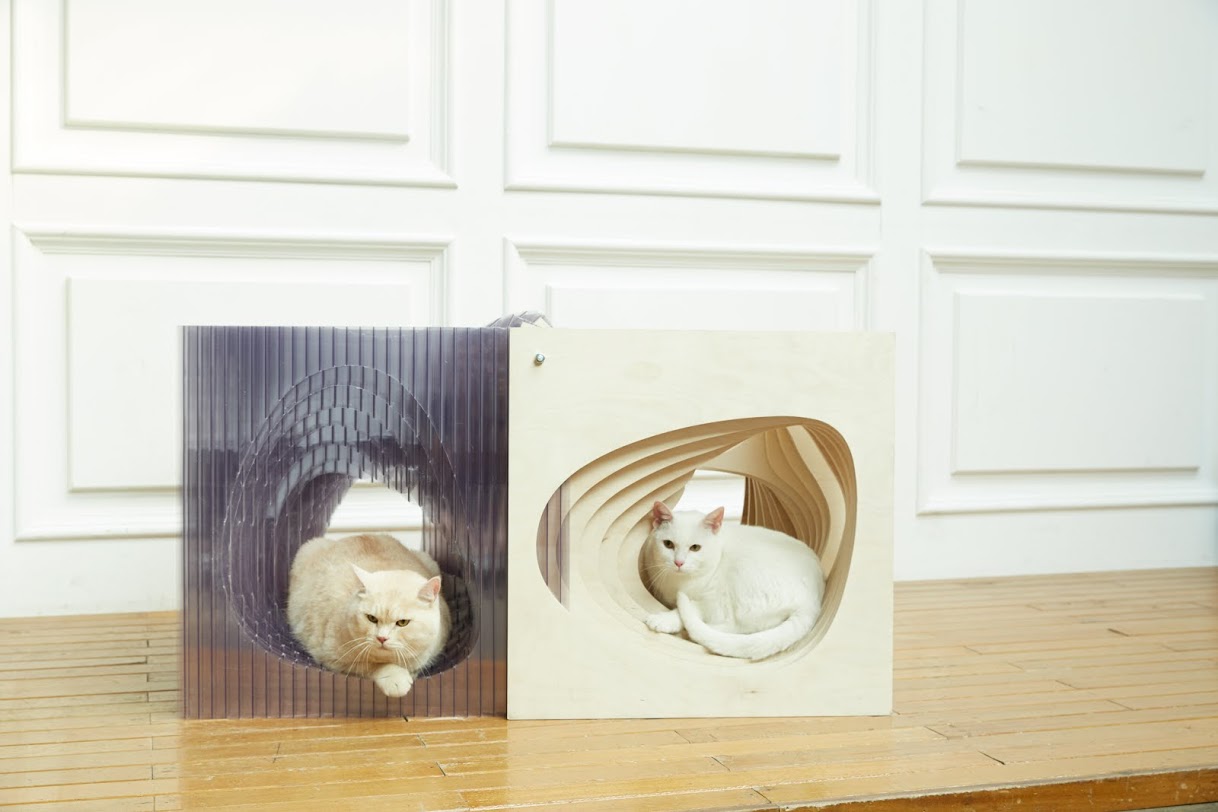 The ‘Twin Caves’ is an extended series of ‘architect's pet house’, which was published in a fashion magazine called ‘Vogue Korea’. Based on the study of Cat’s footprint and habit, the cavernous cat house has four egresses. The mass is formed of the dual-layer system, where the 16mm birch wood panel sticks next to the polycarbonate layers.