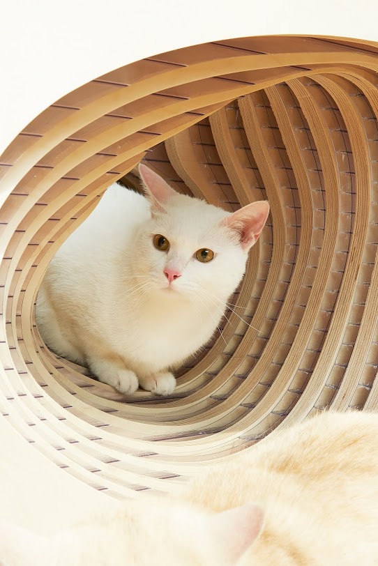 ‘Twin Cave’는 패션 잡지 ‘보그 코리아(Vogue Korea)’에 게재되었던 ‘건축가의 펫 하우스’ 시리즈의 연장선에 있는 프로젝트다. 고양이의 발자국과 습성에 대한 연구를 바탕으로 설계된 이 동굴 형태의 고양이 집은 네 개의 출입구를 갖추고 있다. 매스는 이중 레이어 시스템으로 구성되며, 16mm 자작나무 패널이 폴리카보네이트 레이어 옆에 밀착되어 결합된 형태를 띤다.