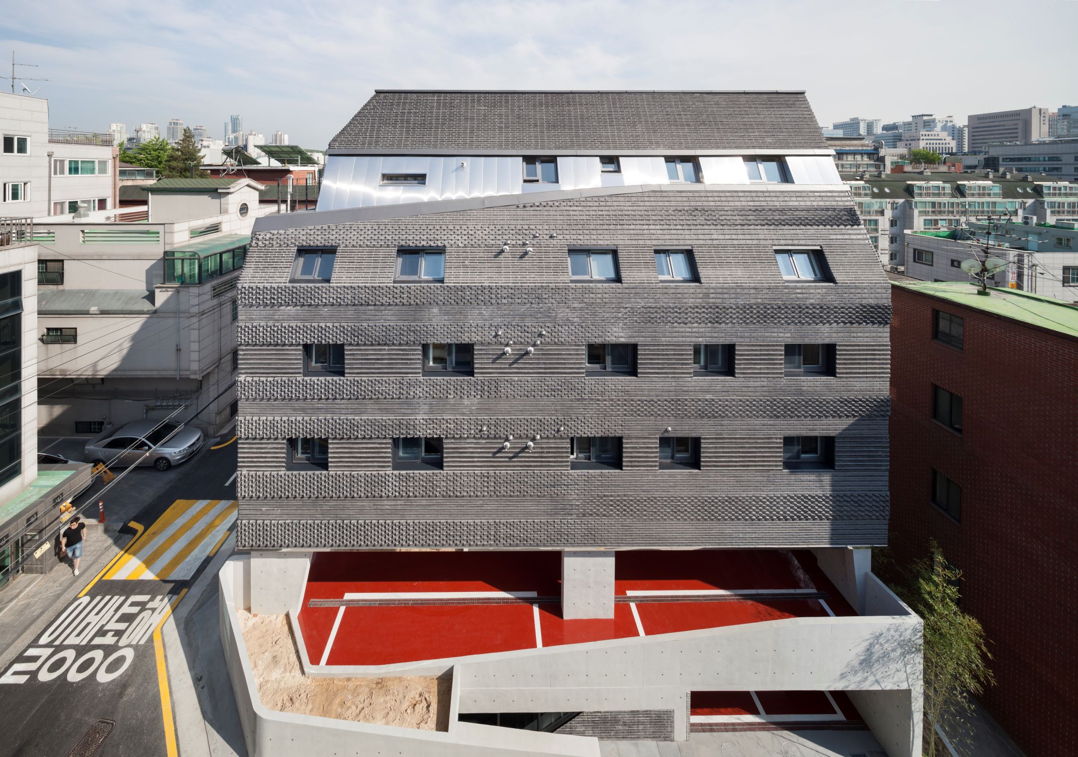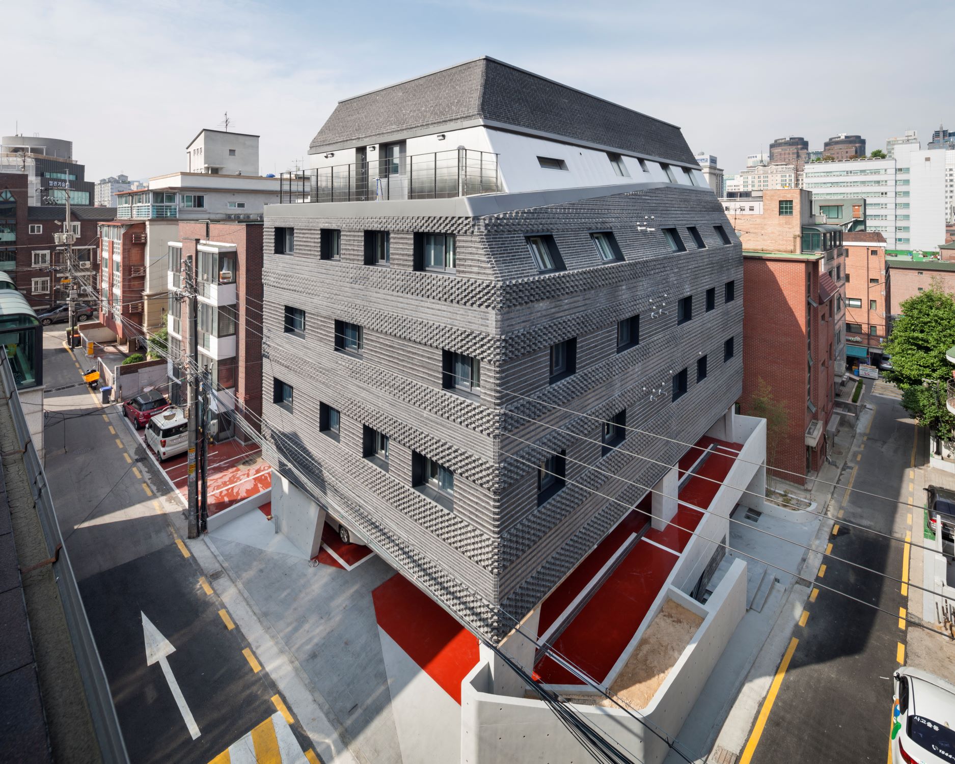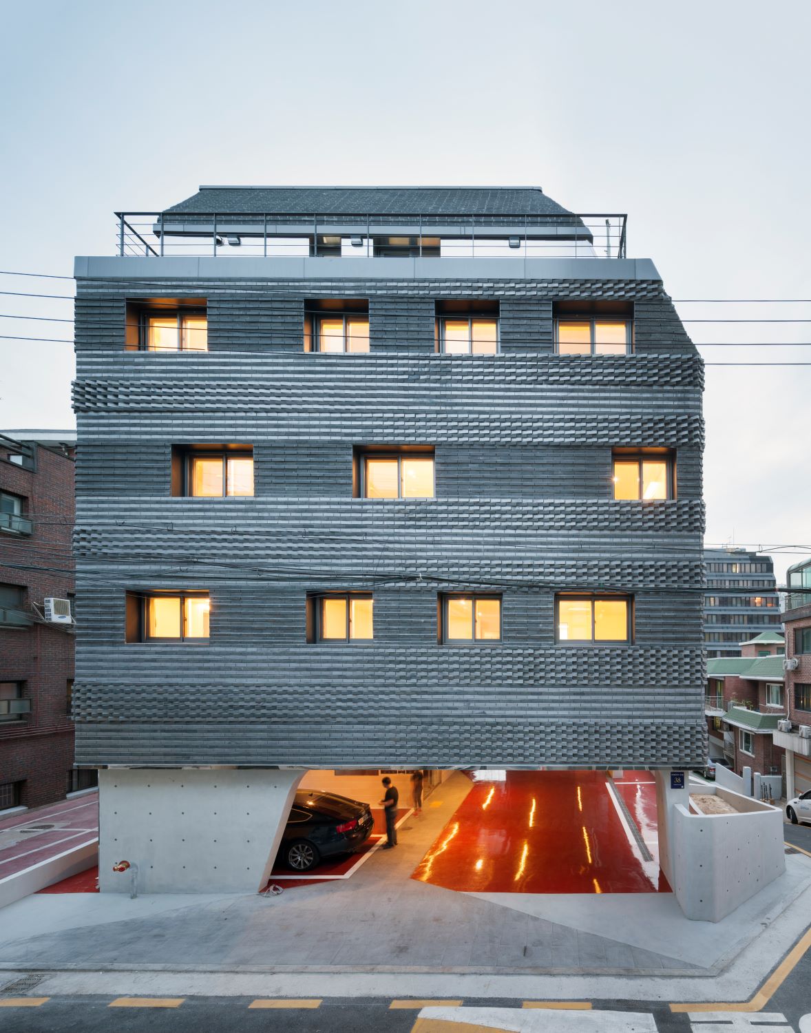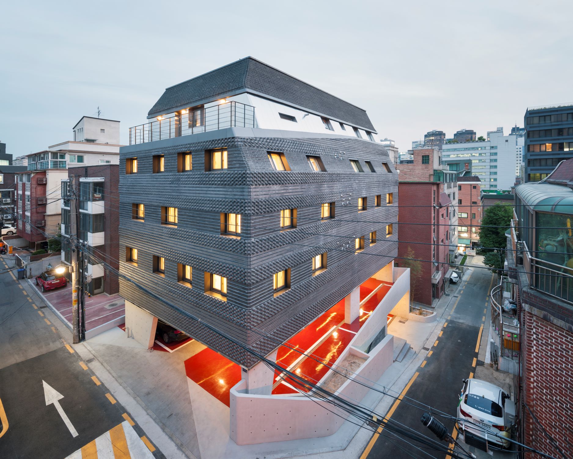 ‘Crossing Bricks’는 경사 지형을 십분 활용하여 다세대 주택의 이상적인 포트폴리오를 제안한다. 이 프로젝트는 주변 건물들과 비교해 임대 경쟁력을 갖춘 건축물을 구현하는 것을 목표로 한다. 그 결과, 저층부의 임대 공간과 상층부의 주거 공간이 공존하는 새로운 비즈니스 모델을 제시한다. 코어를 북향으로 배치해야 한다는 규정 가이드라인에도 불구하고, 공간 효율성을 확보하기 위해 코어를 남향으로 배치했다. 이는 손실될 수 있는 채광 문제를 해결하기 위한 전략적 선택이었다. 상부에는 계단형 단면을 가진 고급 창호를 설치해 자연 환기와 채광을 유도했으며, 이를 통해 북쪽에서 남쪽으로 이어지는 복도와 방 전체에 햇빛이 스며들게 했다.