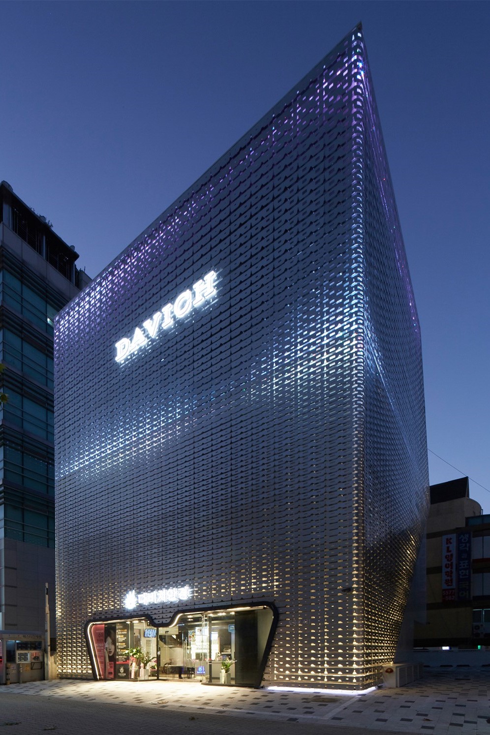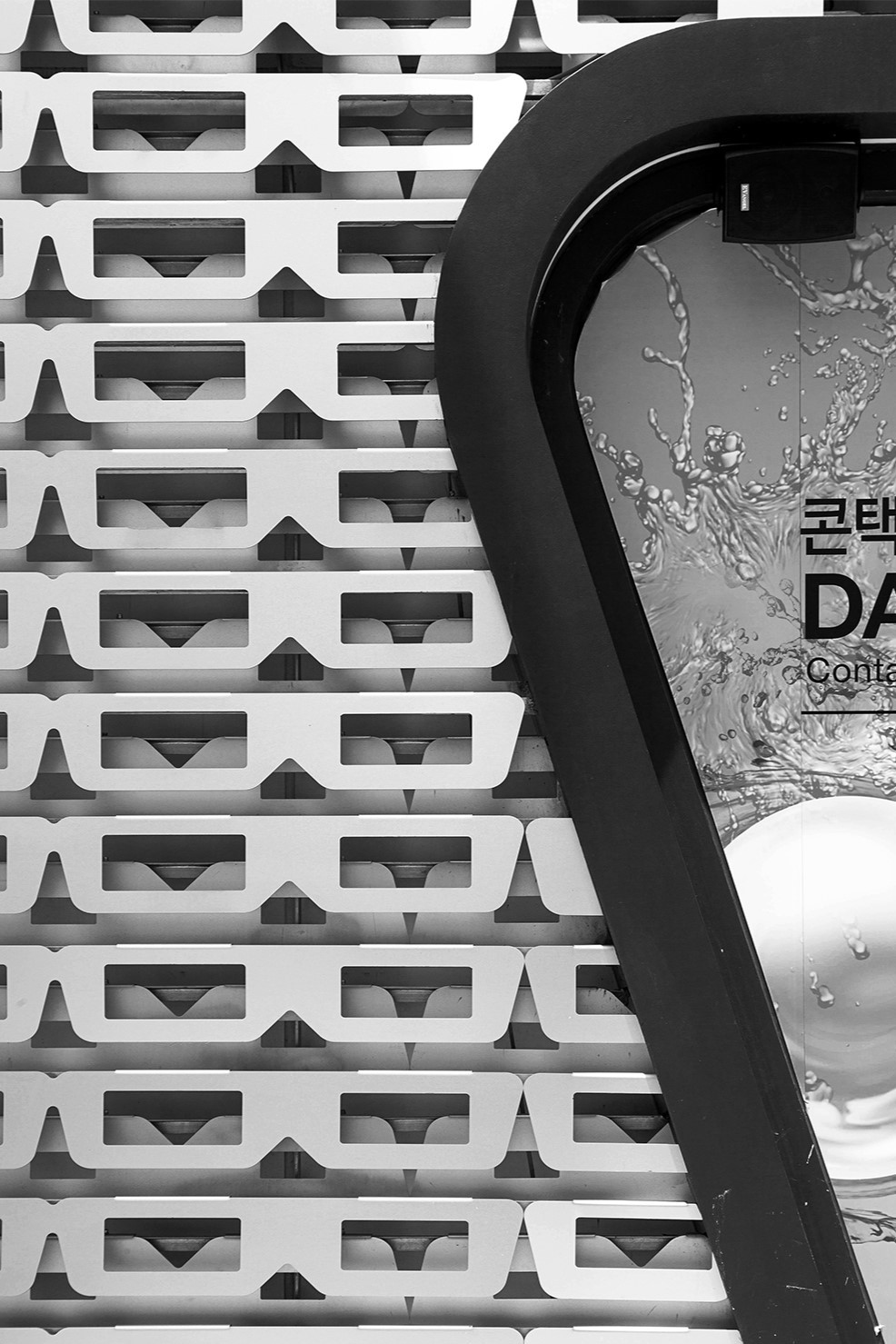 The 'Countless Glasses' expresses an idiosyncratic architectural illustration of an optician shop, liberated from the formative image. An early concept started from a circle, the shape of glasses. The repetition of circles creates diverse patterns on the façade. Overlapping one another, it intended to portray a specific image through groups of such repetition. The image made from groups of overall patterns symbolizes the flow of a river, one inspired by the owner's hometown. 3,600 panels with glasses pattern interact over such primary side, forming the façade. Panels with glasses patterns, which determine the external image consist of inner and outer panels, are placed alternately. The combination of panels in different sizes of openings leads to the rich texture of the façade and in-depth sensitivity. A flow of various light beams makes the surface look different slightly. Emphasizing the aesthetic, anodized coatings are to be applied over 2mm aluminum. As inner and outer panels intercrossed, the panel brackets assembly and configuration methods were considered a key role in the construction. The vertical structure supports the vertically bungled 3,600 panels and horizontal brackets. LED lights are to be constructed accordingly to procedures and rules. During the day, it preserves the aesthetic tactility of aluminum, while at night, various images are projected to the facade under a certain LED program.