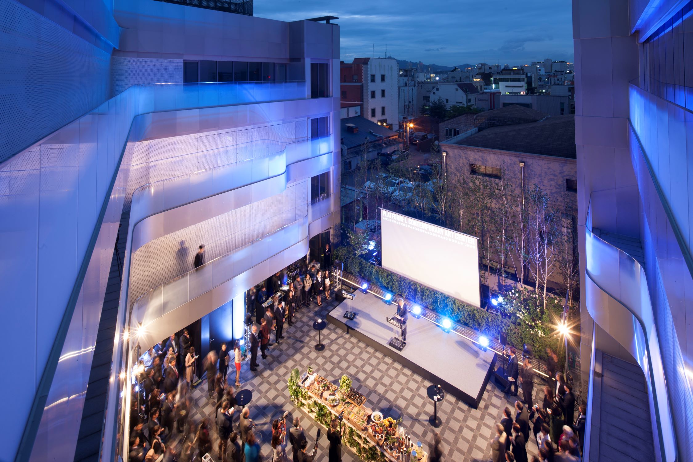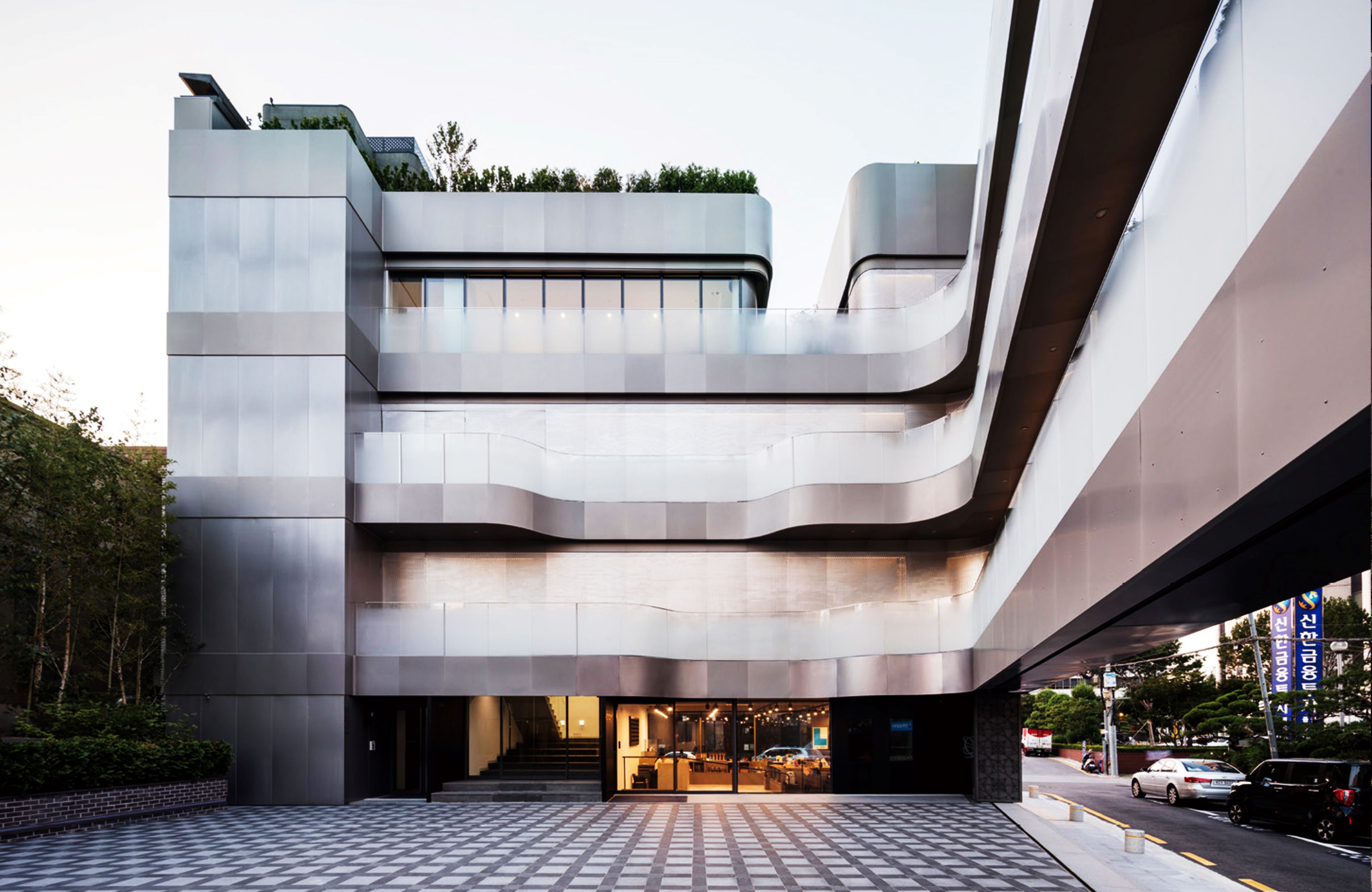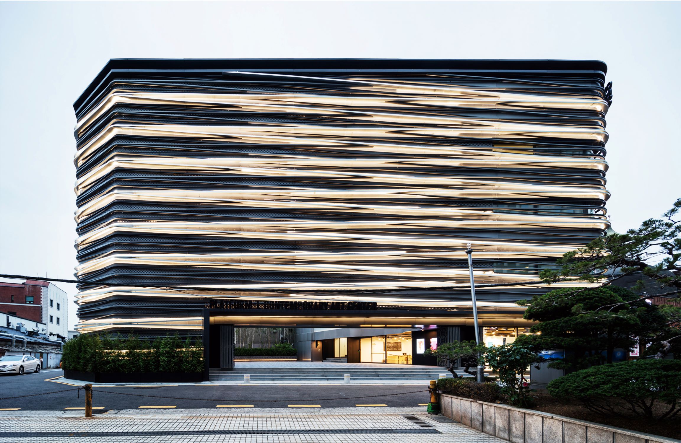 Platform-L Contemporary Art Center is located in a residential area of the Gangnam district in Seoul, South Korea. The site's irregular geometry - an irregular trapezoid - and being surrounded on three sides by street presented was a unique design challenge. The Laws of Architecture on the proposed site limiting building ratio to be no more than 60% of the total site area was a key focus to the design of Platform-L. This restriction typically leads to most projects designating parking to be on grade with a large mass covering the rest of the site. Platform-L situating the parking to underground allow for void space on grade. The design of two independent masses with a central courtyard opening to the west proved to be the most efficient use of space. The north end mass is comprised of the museum's entrance, two exhibition spaces, VIP lounge, as well as featuring a roof terrace looking out towards the cityscape. On the south end of the site, a cafe/restaurant and office spaces are located. The exterior façade design inspiration came from Louis Quatorze's fashion design company. This company is the sponsor for Platform-L and ideology is based on Louis XIV. The use of basic geometries of Louis XIV was reinterpreted to become the design for the façade of Platform-L. This design stands as a new symbol for the company and its high regard for fashion and culture.