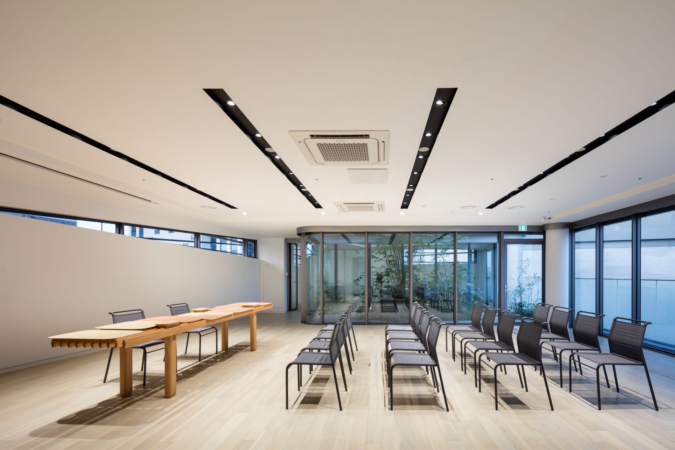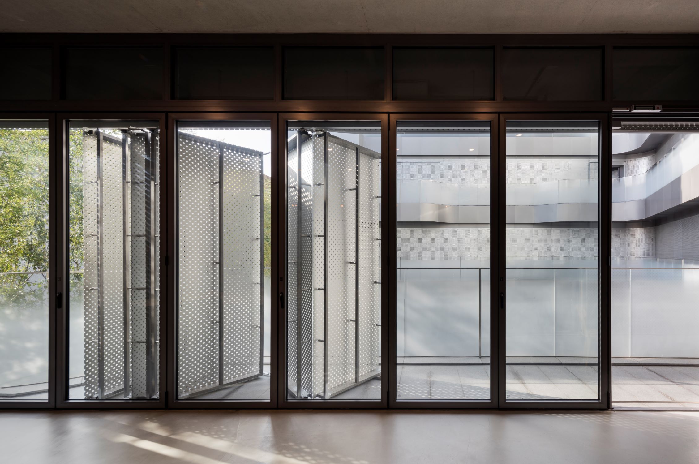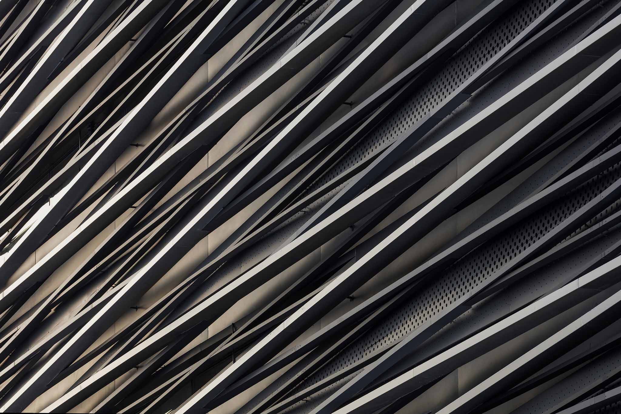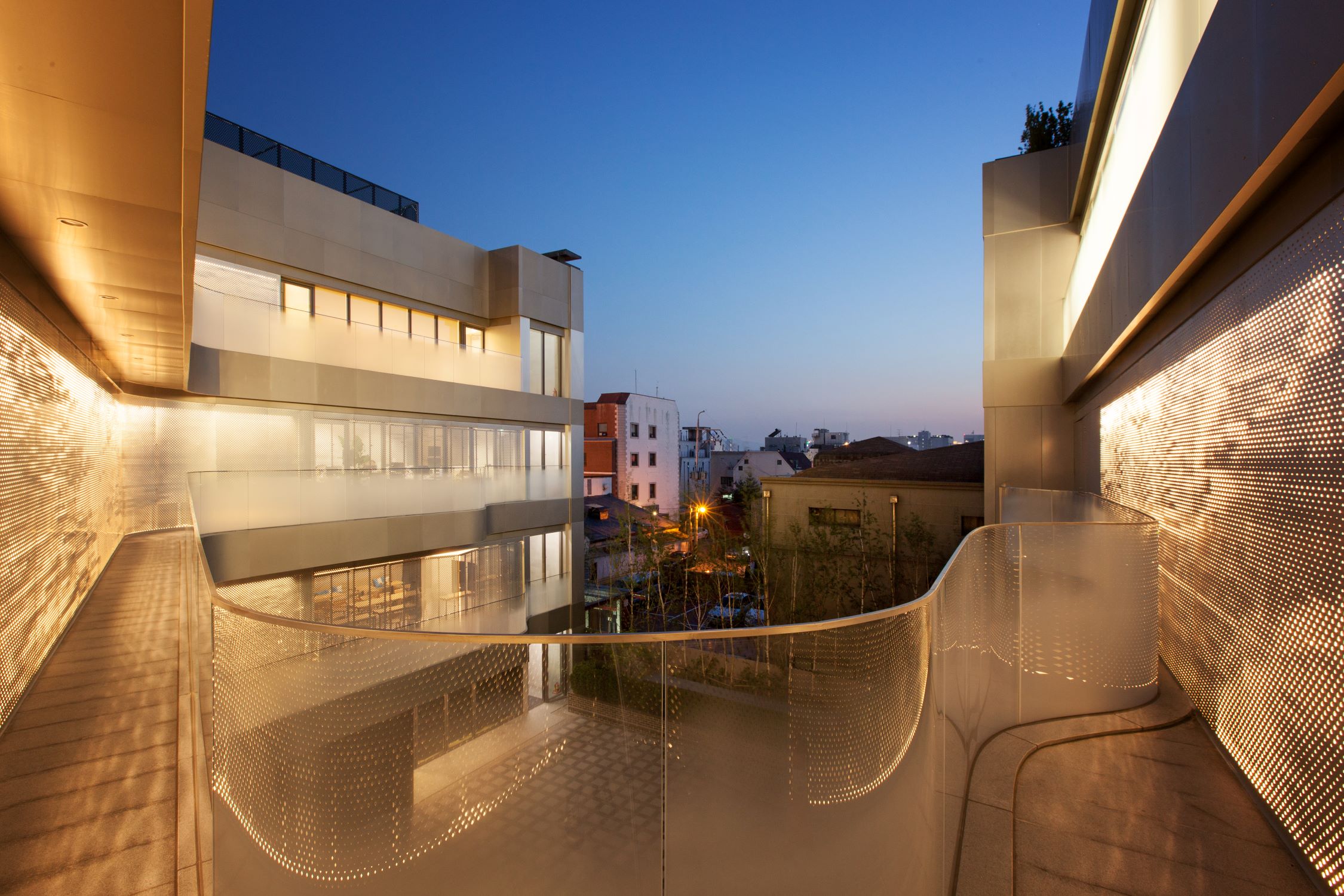 Platform-L Contemporary Art Center is located in a residential area of the Gangnam district in Seoul, South Korea. The site's irregular geometry - an irregular trapezoid - and being surrounded on three sides by street presented was a unique design challenge. The Laws of Architecture on the proposed site limiting building ratio to be no more than 60% of the total site area was a key focus to the design of Platform-L. This restriction typically leads to most projects designating parking to be on grade with a large mass covering the rest of the site. Platform-L situating the parking to underground allow for void space on grade. The design of two independent masses with a central courtyard opening to the west proved to be the most efficient use of space. The north end mass is comprised of the museum's entrance, two exhibition spaces, VIP lounge, as well as featuring a roof terrace looking out towards the cityscape. On the south end of the site, a cafe/restaurant and office spaces are located. The exterior façade design inspiration came from Louis Quatorze's fashion design company. This company is the sponsor for Platform-L and ideology is based on Louis XIV. The use of basic geometries of Louis XIV was reinterpreted to become the design for the façade of Platform-L. This design stands as a new symbol for the company and its high regard for fashion and culture.