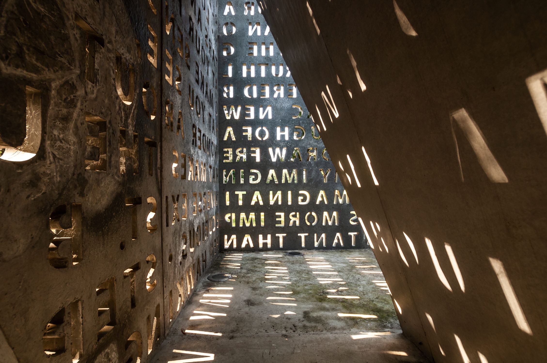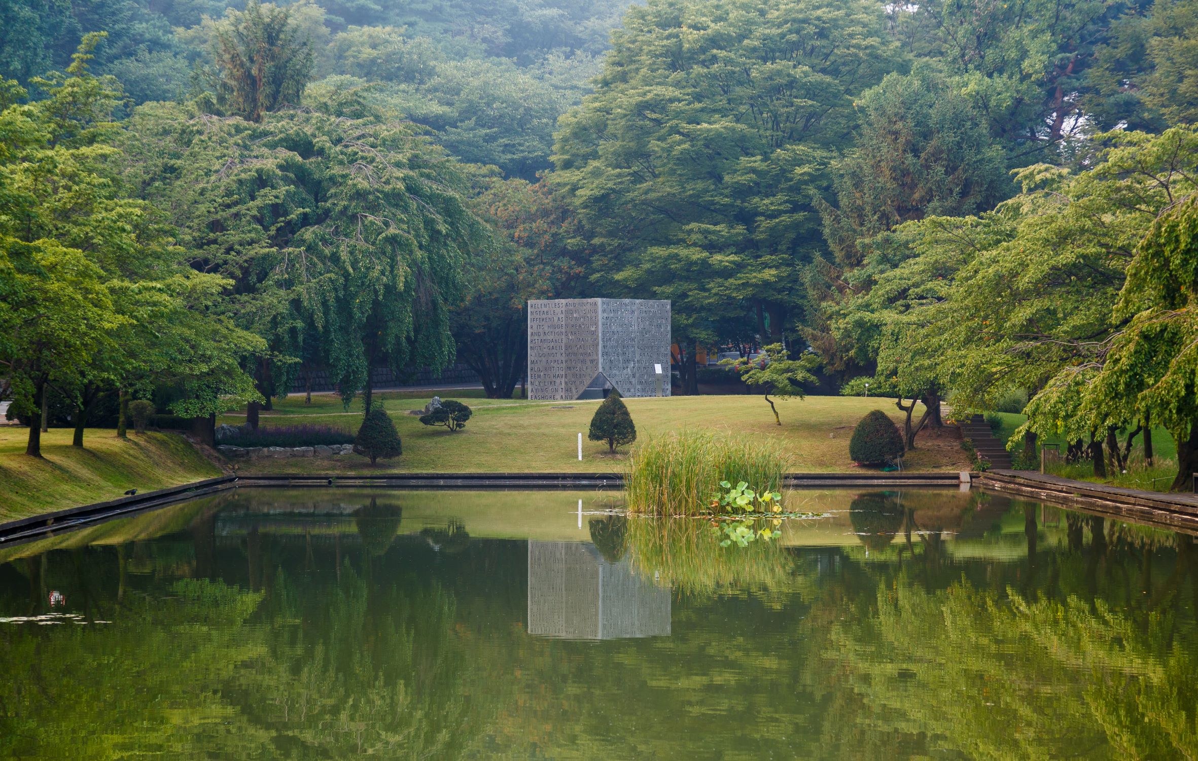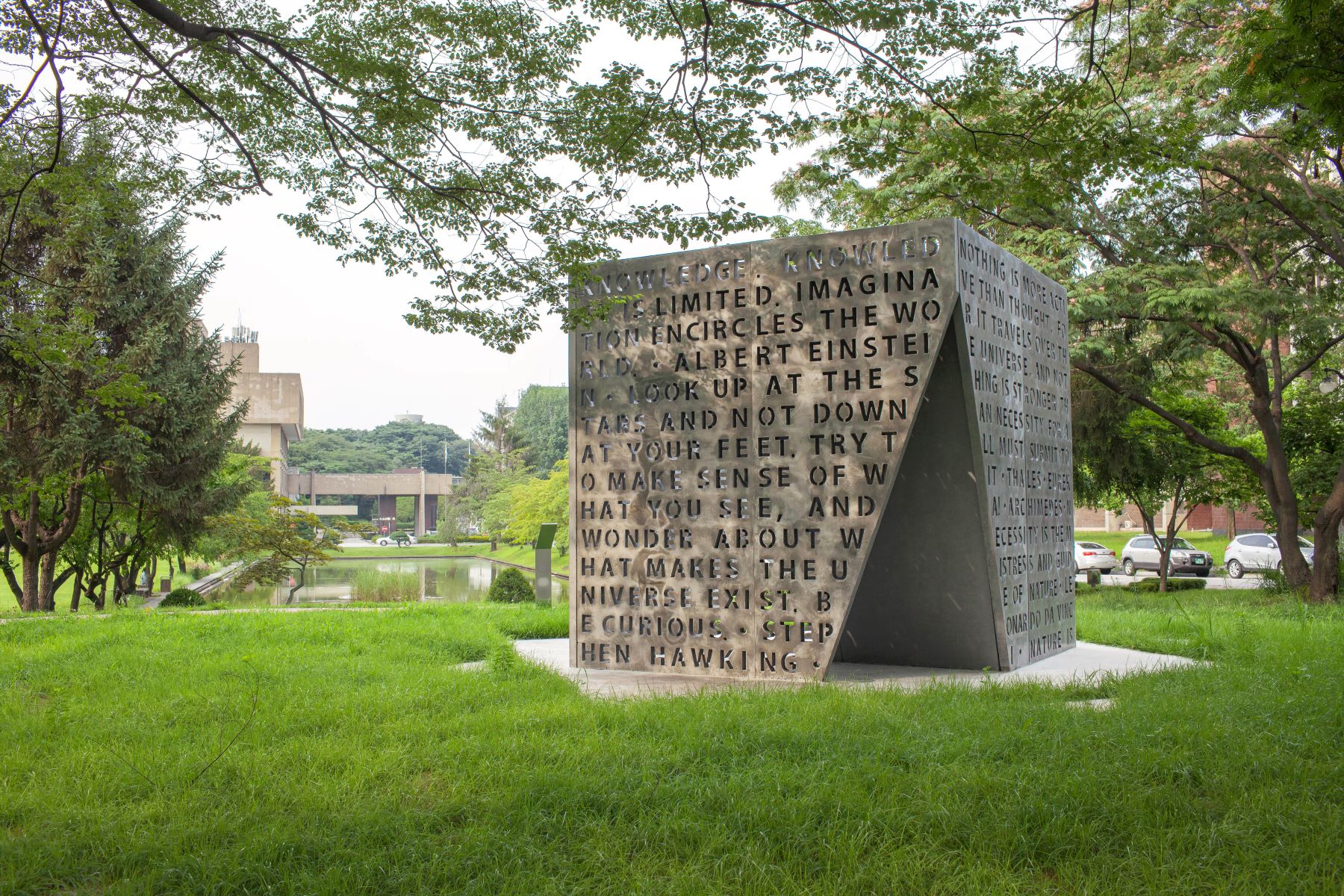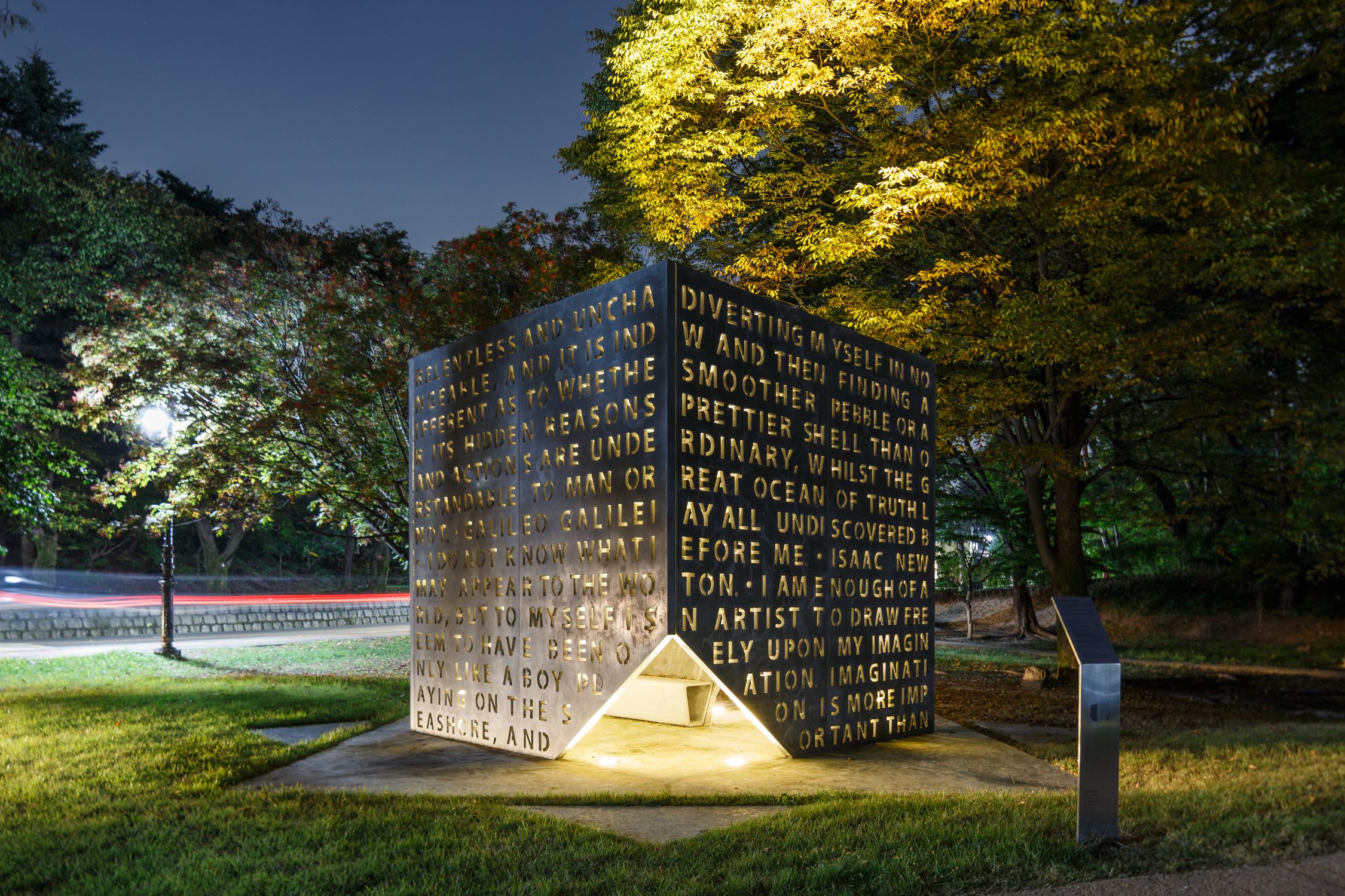 KIST Meditation Pavilion is a transformative architecture that interprets a strategic exploration of materiality. Sculpted as a commemoration of the 50th anniversary of KIST (Korea Institute of Science and Technology), the project attempts to tackle the challenge of constructing the building with only a single material that accentuates the very philosophy of innovation in science and technology. Structured at 3.65cm long by 3.65cm wide by 3.65cm high were four 8cm thick UPC panels with 853 inscriptions of the most influential scientific inventors' names. The panels were effectively customed and designed, given the easy workability of UPC as material. The essential study of architectural engineering upon how the panels could support themselves despite the perforations from the carved letters becomes the key to realize the intended approach.