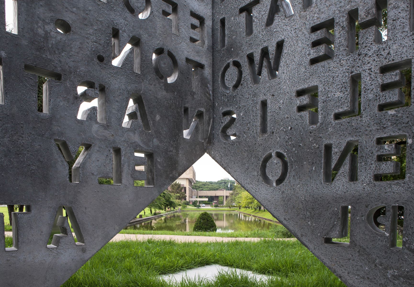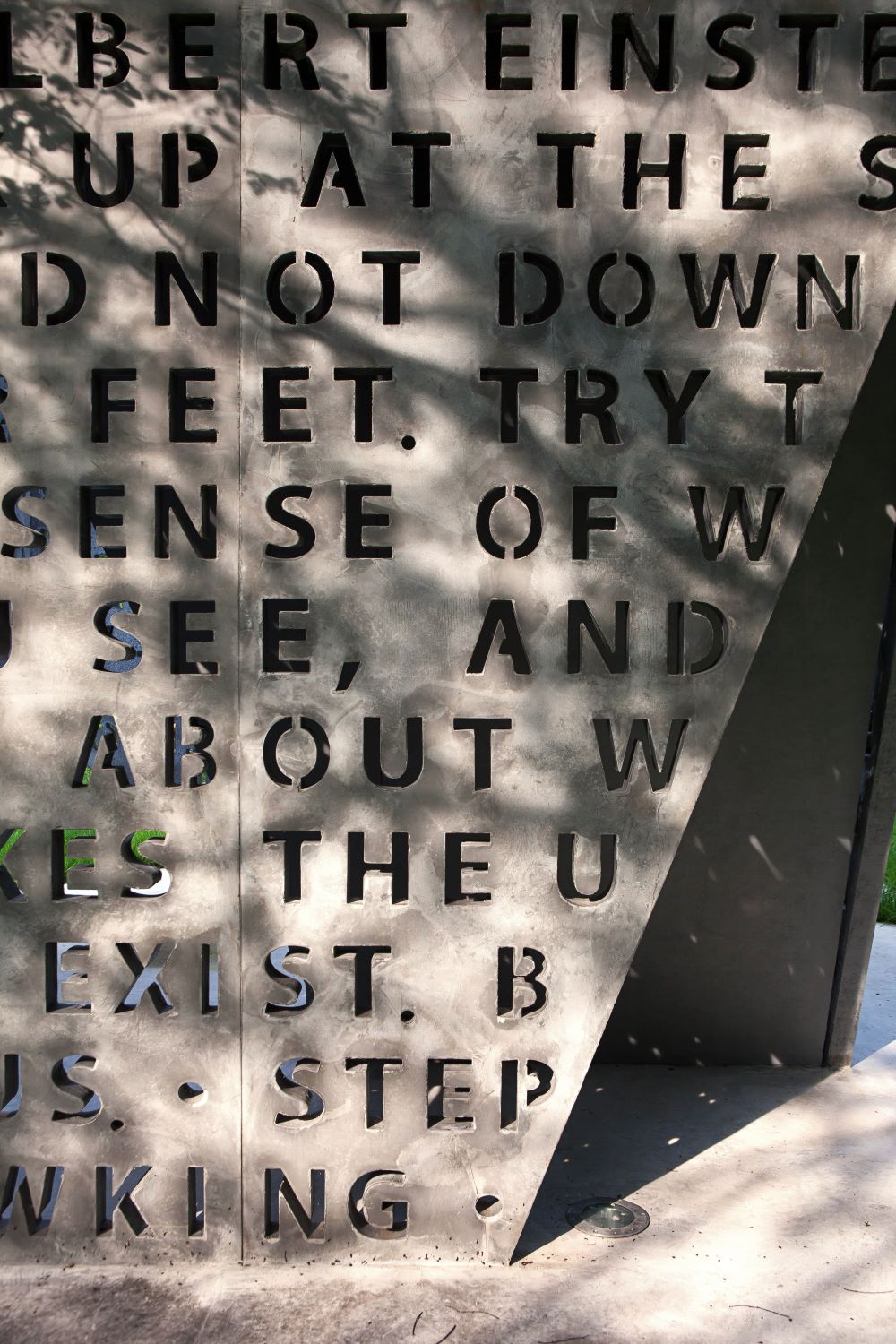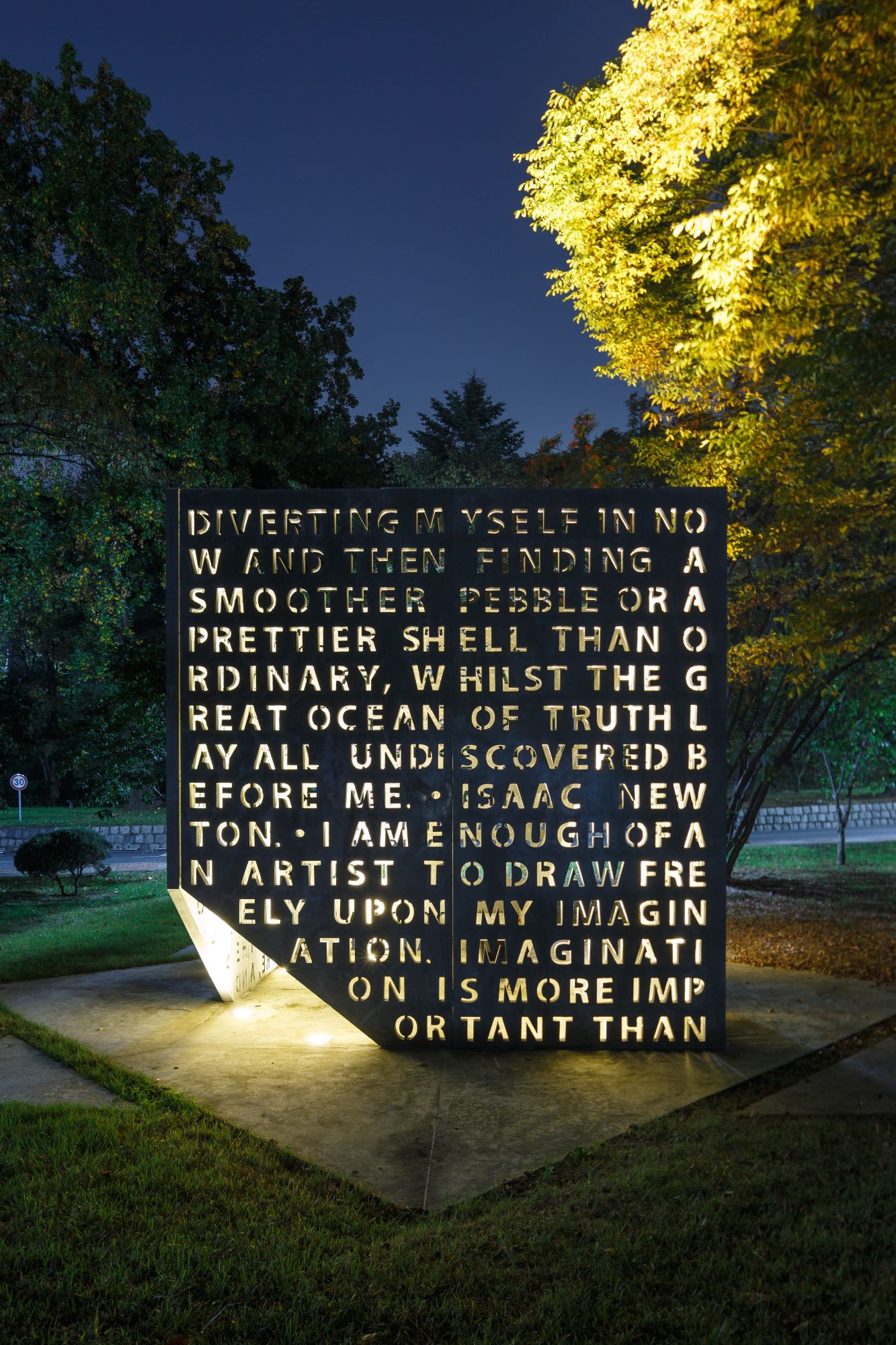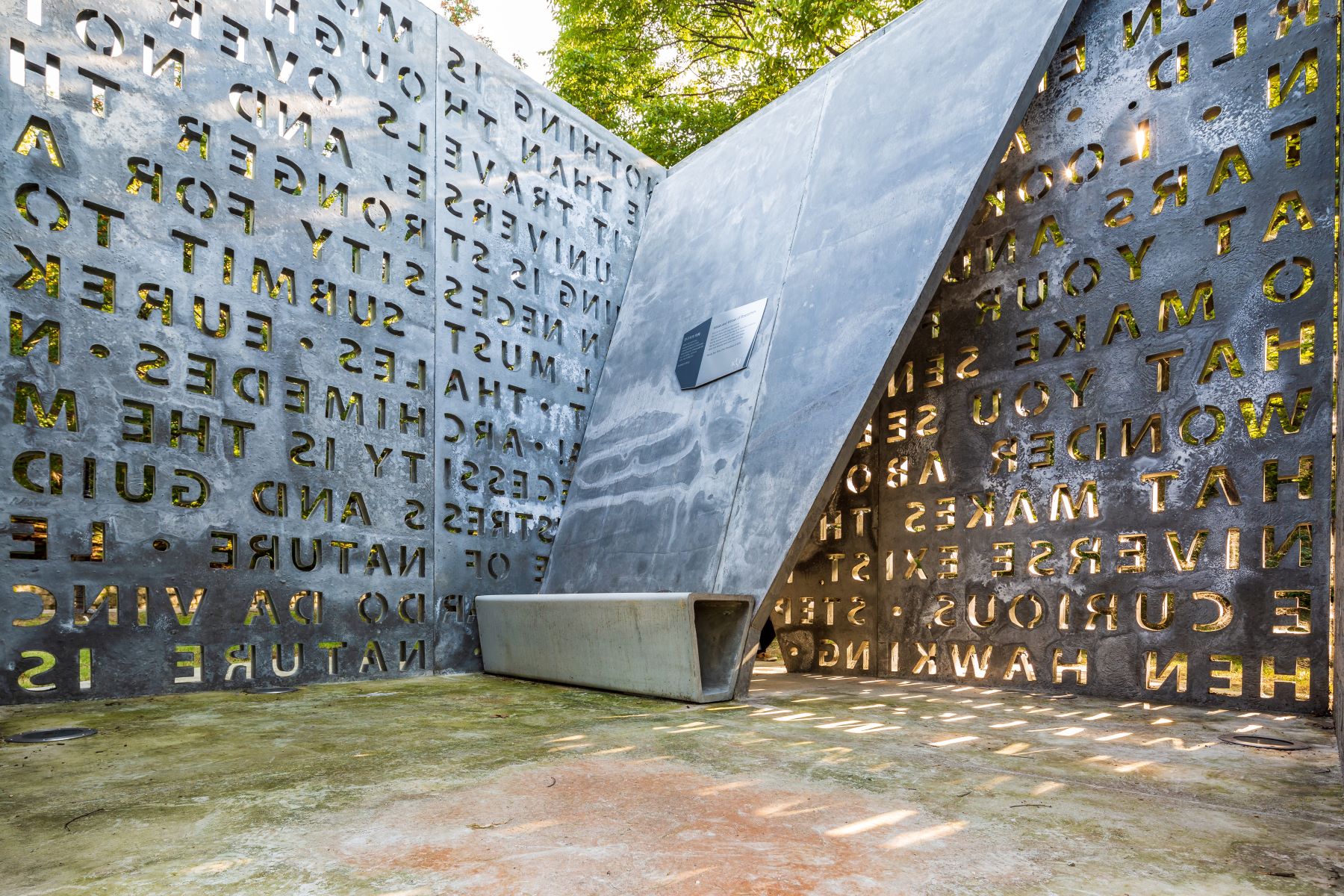 KIST Meditation Pavilion is a transformative architecture that interprets a strategic exploration of materiality. Sculpted as a commemoration of the 50th anniversary of KIST (Korea Institute of Science and Technology), the project attempts to tackle the challenge of constructing the building with only a single material that accentuates the very philosophy of innovation in science and technology. Structured at 3.65cm long by 3.65cm wide by 3.65cm high were four 8cm thick UPC panels with 853 inscriptions of the most influential scientific inventors' names. The panels were effectively customed and designed, given the easy workability of UPC as material. The essential study of architectural engineering upon how the panels could support themselves despite the perforations from the carved letters becomes the key to realize the intended approach.