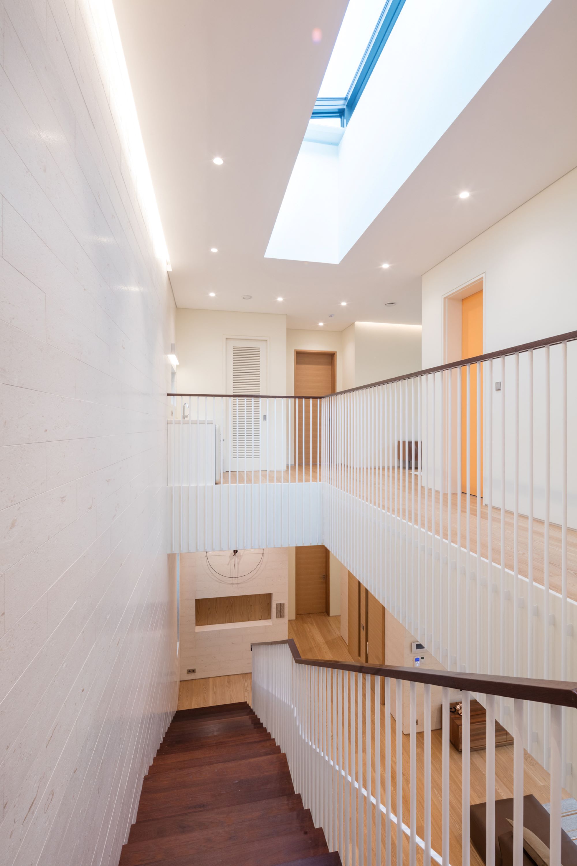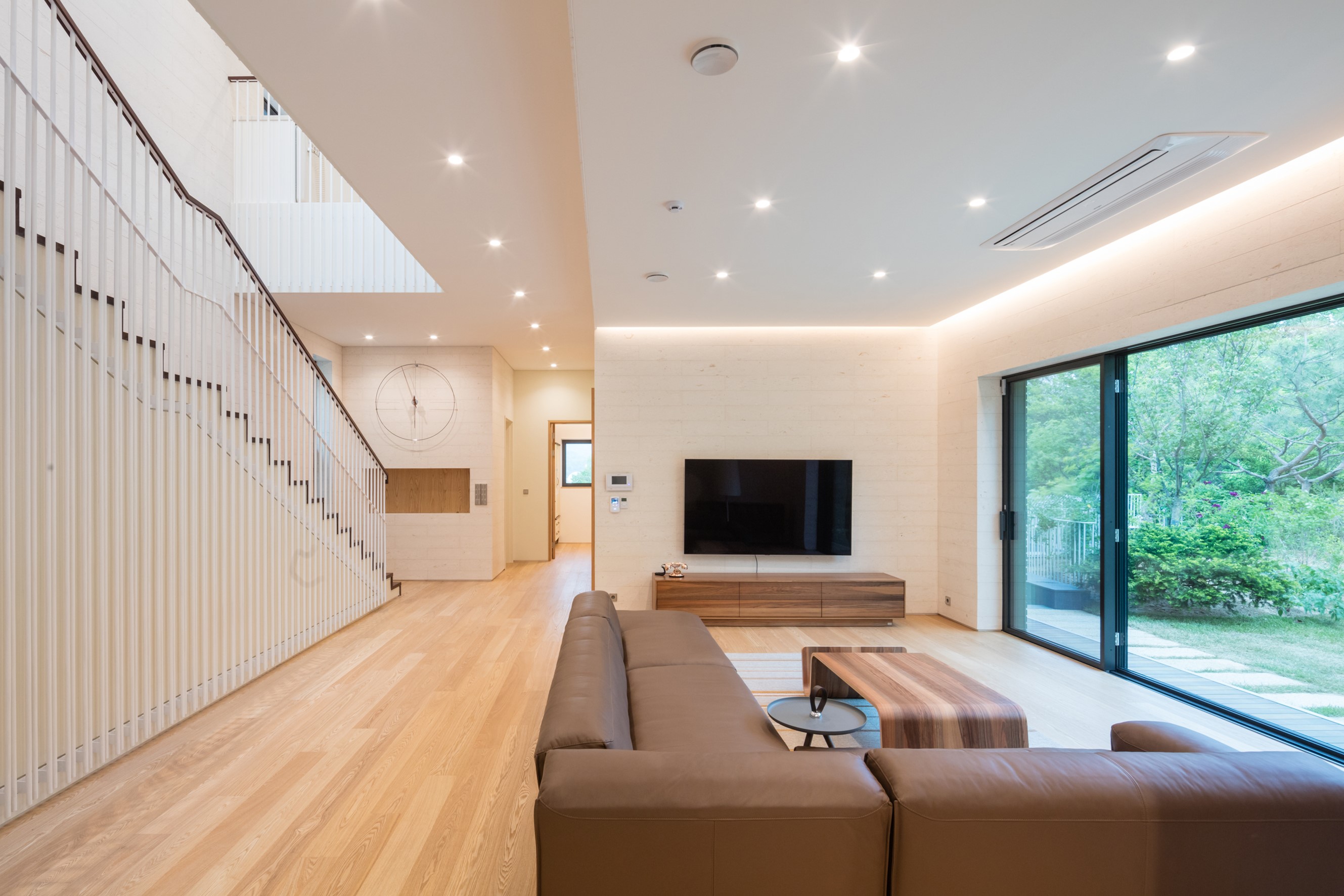 과천에 위치한 Eaves house는 한국의 전통 처마 형태를 재해석해 환경과 미적 기준을 충족하는 방법을 보여준다. 이 사이트는 관악산과 청계천 사이에 위치하여 주변 경관을 한눈에 볼 수 있다. 이 프로젝트의 목표는 자연과 공간적 경험이 공존하는 건축적 결과를 만들어 내는 것이다. 주변 산의 곡선에서 영감을 받은 곡선은 햇살이 비치는 남동쪽을 향해 열린 전망과 함께 주변 경관의 연장선으로 반영된다. 디자인의 주요 특징으로 강조된 처마는 한국 전통 지붕(처마)에서 근본적으로 영감을 받았다. 그 아래 구조는 흰색으로 칠해진 스테인리스 파이프로, 각각 한국 전용 미학을 반영한 무늬를 가지고 있다. 이렇게 구성된 라인은 낮에는 햇빛을 차단하고 야간에는 설치된 조명에서 나오는 빛을 제어한다.