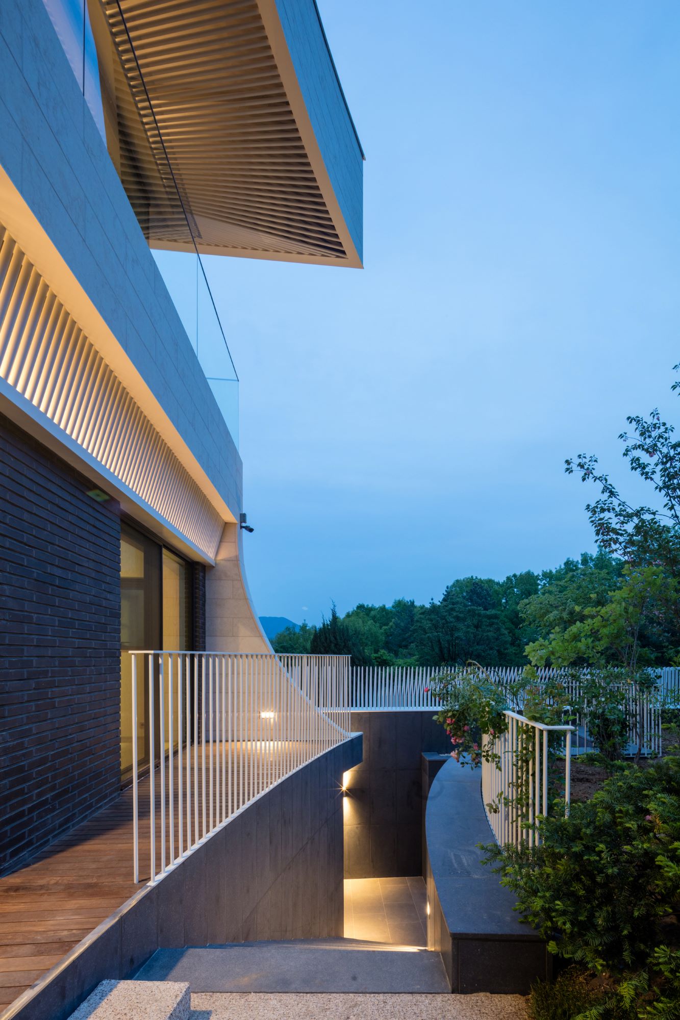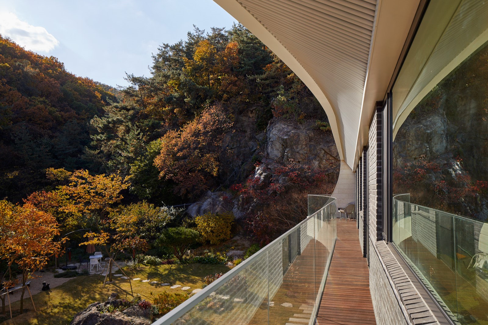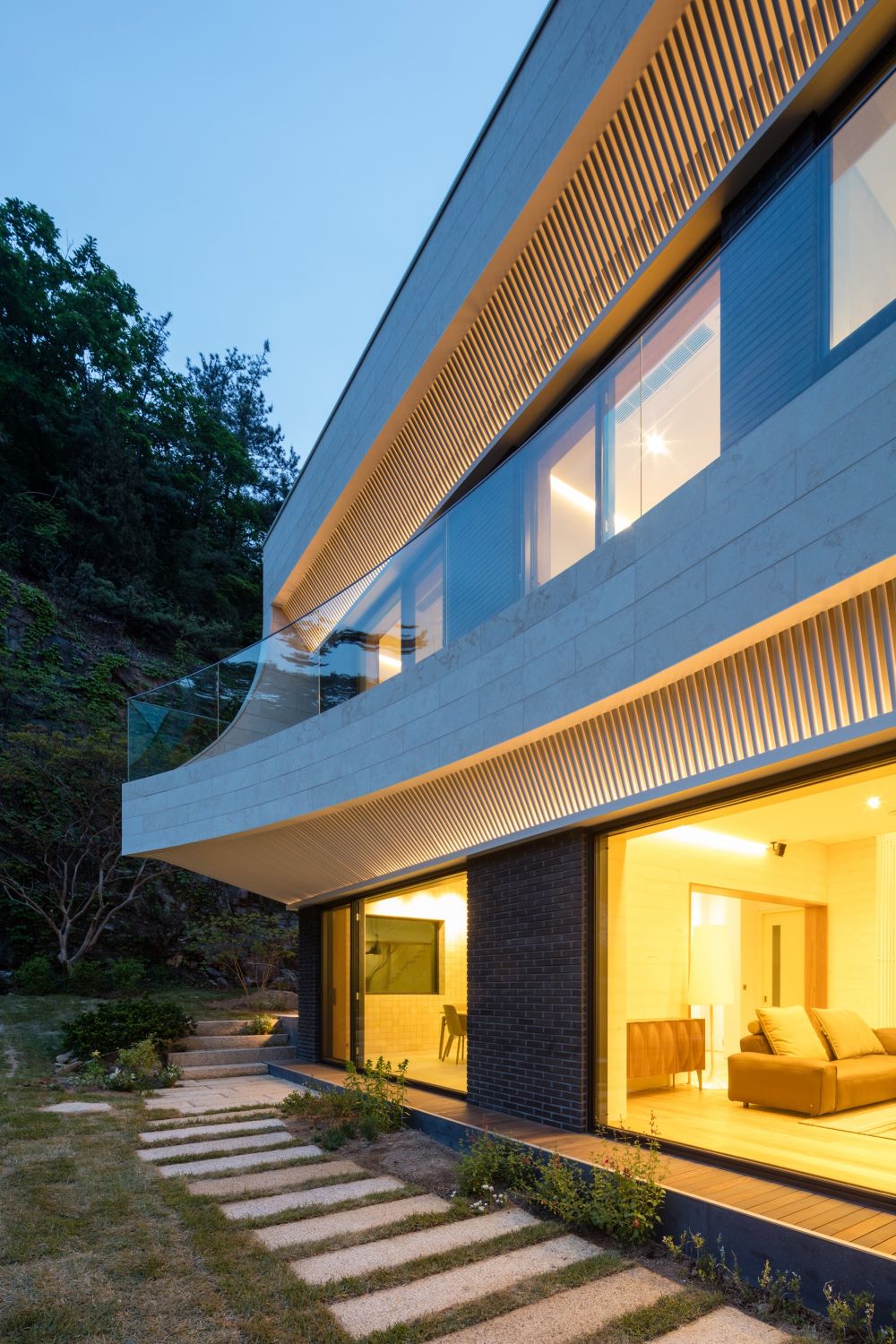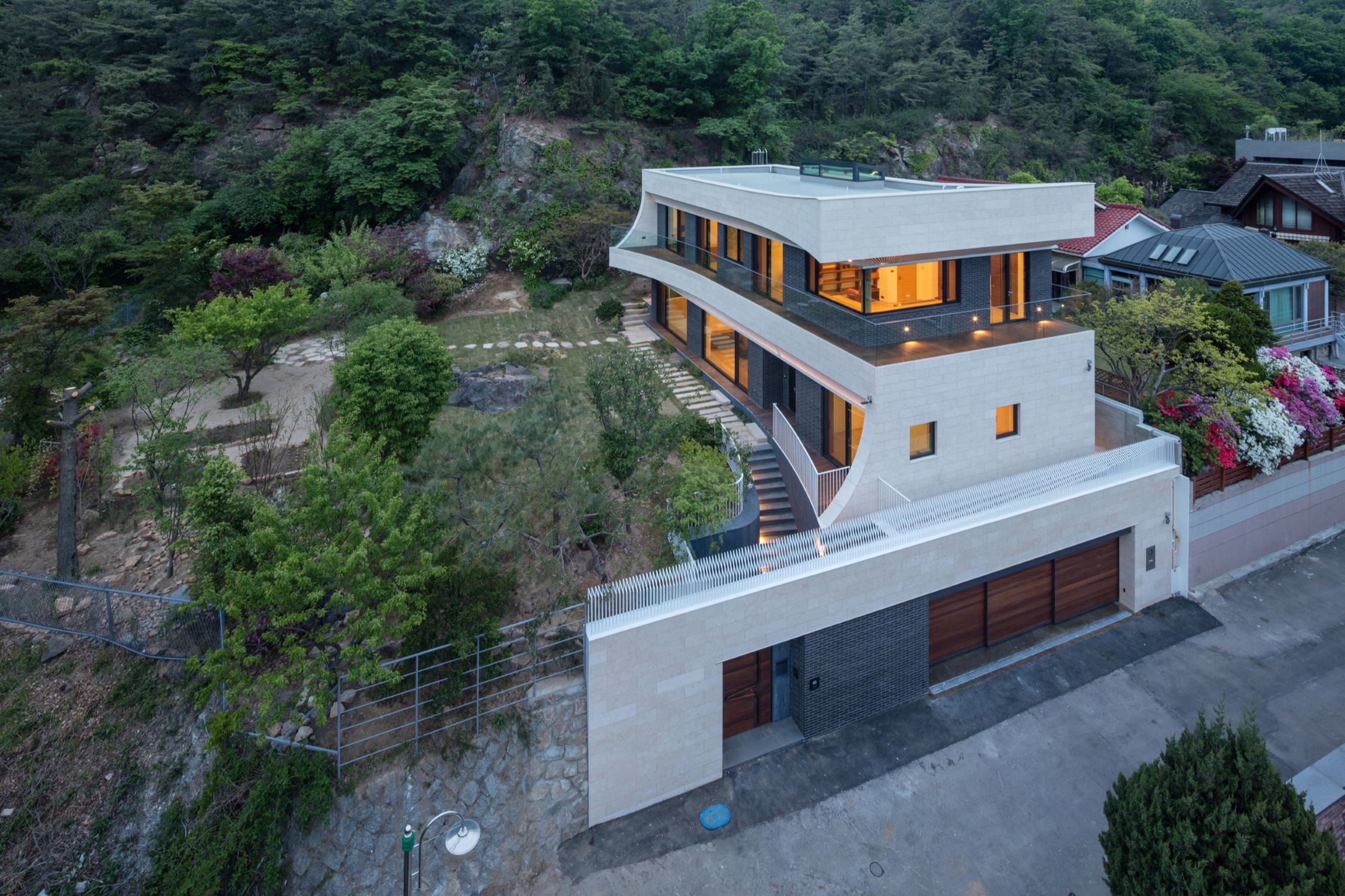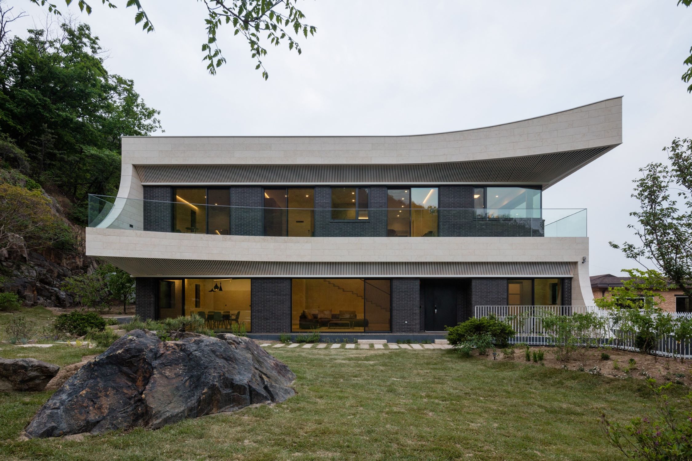 Eaves house, a home for a couple in Gwacheon, portrays how to re-intepret traditional Korean eave typology to achieve high environmental and aesthetical standards. Located in between Gwanaksan Mountain and Cheonggyecheon Mountain, the site offers a panoramic view of its surrounding landscape. The project aims to achieve an architectural outcome where the balance between nature perseverance and spatial experience coexist. The curves, inspired by the curvature of the surrounding mountains, reflect as an extension of the surrounding landscape with vista opened towards the sun-lit Southeast. The eaves, highlighted as the main feature of the design, were inspired radically by the Korean Traditional Roof (Cheo-ma).