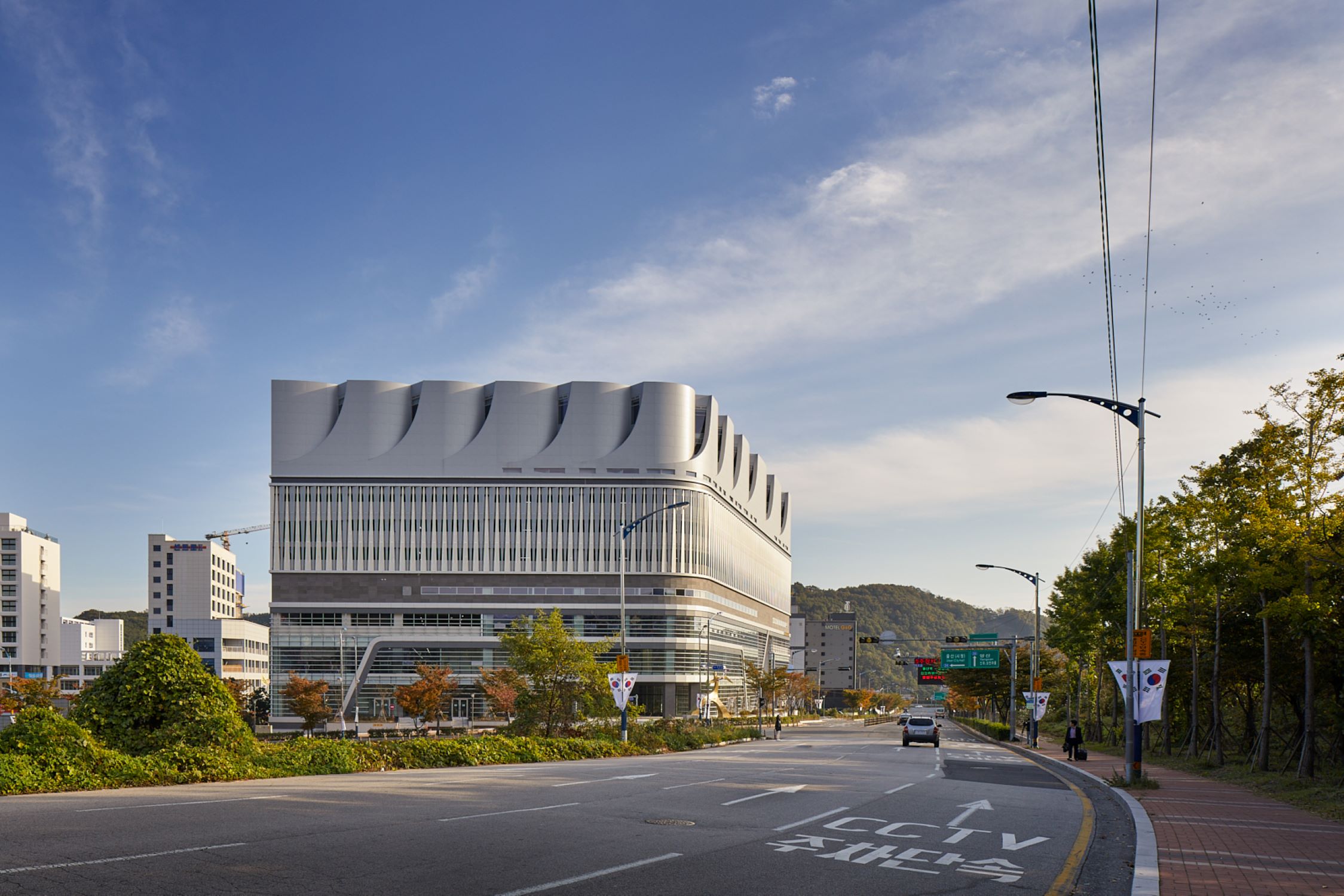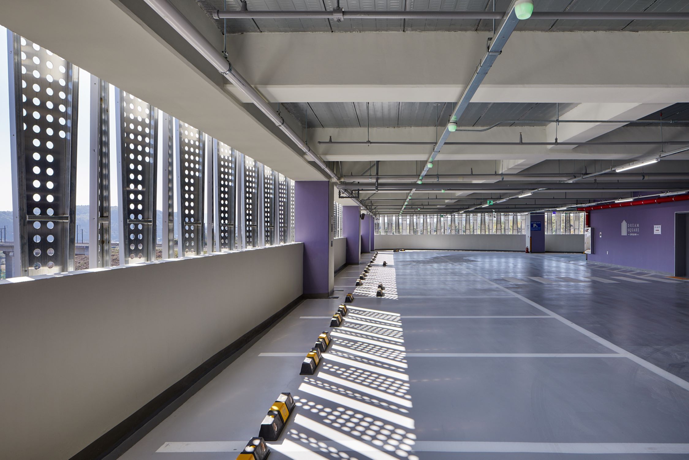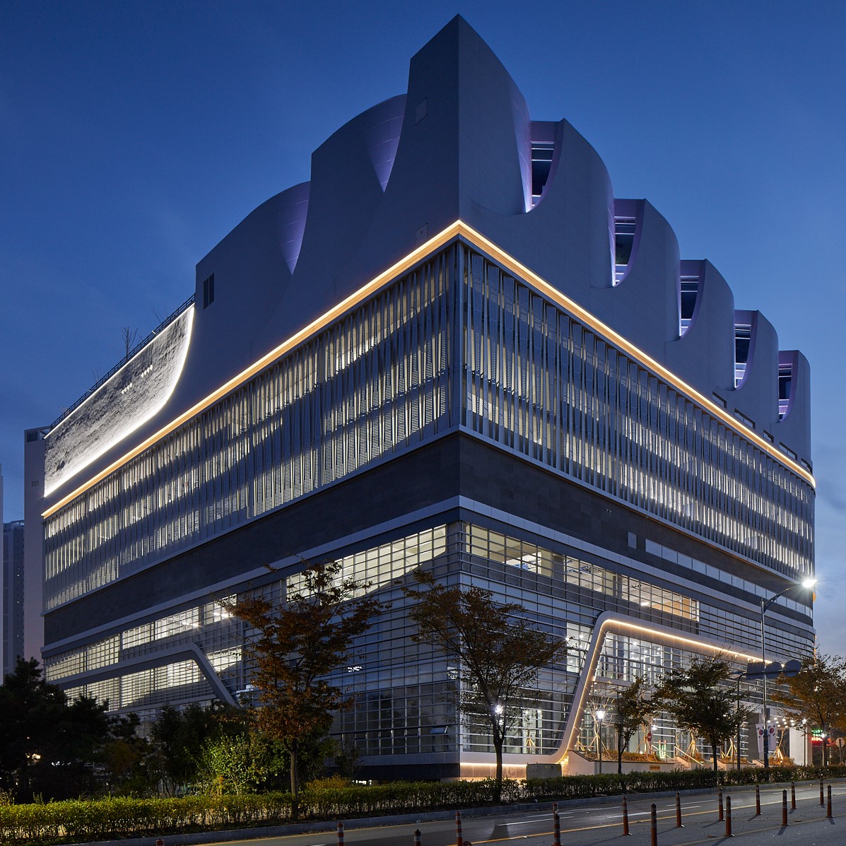 Reckoned as the new hub of Ulsan city, KTX Parking Complex successfully set an example in strategizing commerciality while tackling various urban interventions. The site, located in front of the crowded Ulsan KTX Station, was faced with the juxtaposition of the parking crisis and neighboring commercial districts. The project finds its significance throughout the complexities of fulfilling the parking demands along with numerous compositions of retails and commercials. Hence, the establishment of such commercial axis wrapped in iconic identity proposes a punchline to the design approach. According to Korea build regulation, a parking building should consist of 30% commercial to 70% parking of total gross floor area, respectively. The project, adopting similar terminology, distinguished itself through the composite relationship between the parking and the program, which has been resolved in various ways. The lower levels support public engagements through various commercial amenities while silmutaneously address the demands of basement parking. The top floor is reserved for wedding and convention areas. Complimenting this was the in-between parking (semi-private parking) for visitors attending the event. The programs, strategically stacked vertically, offered flexible distributions of the spatial arrangement, taking account of many characteristics of space. Similarly to its composition, the project adopted identical algorithms to its facade. Glass facades with aluminum lovers are applied to lower section frontage, interpreting the speed of KTX. The semi-private parking is enclosed transparently with perforated aluminum panels adjoined at a customized angle, projecting an interplay between day and night. Not to mention the top event space formed with curved aluminum composite panel symbolizing the curvature of the wave of Ulsan sea, silmutaneously the tulip flower that represents wedding Subsequently, this compound strategy flows back to the architectural concept of a hub and transit gateway.