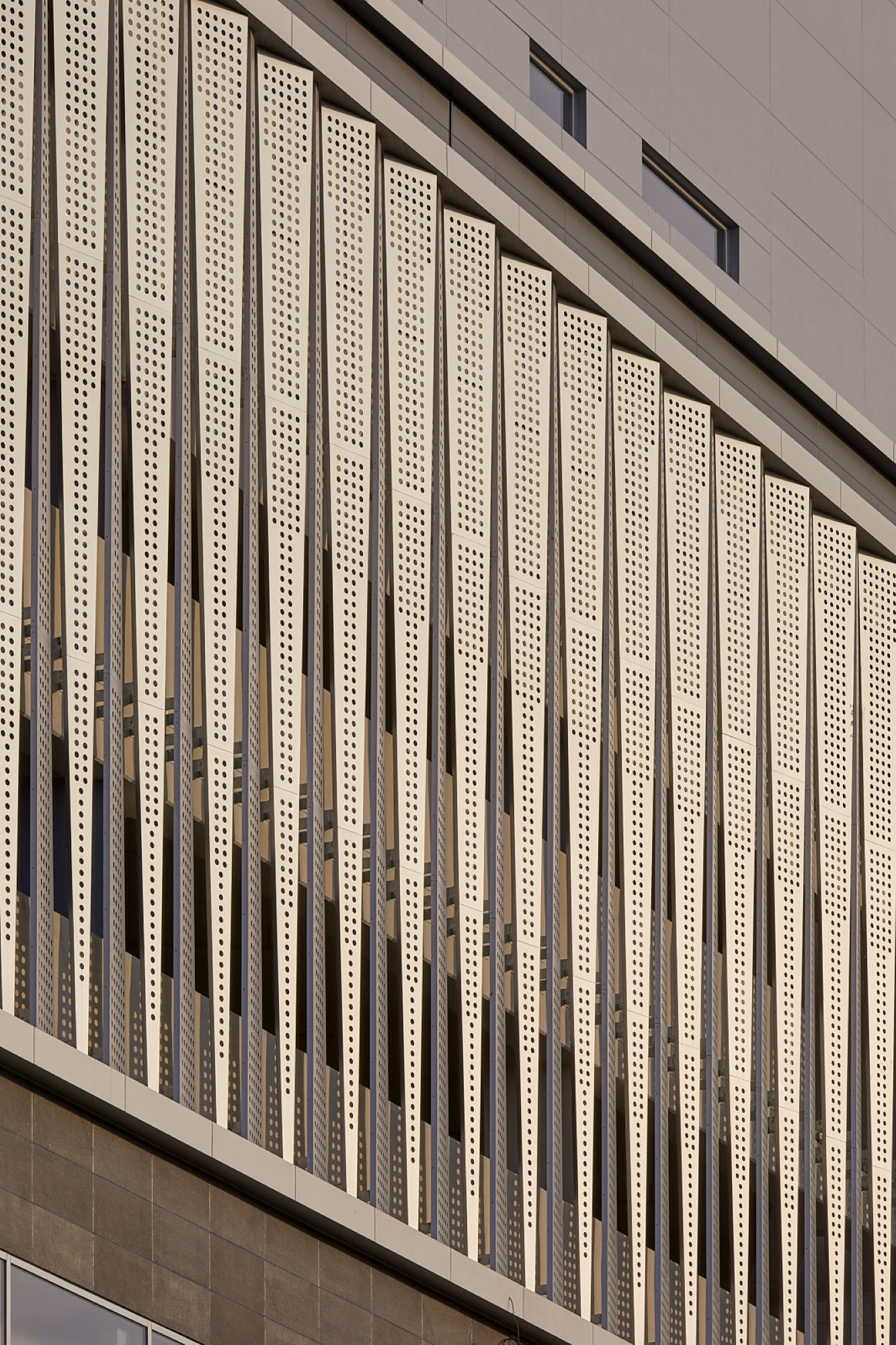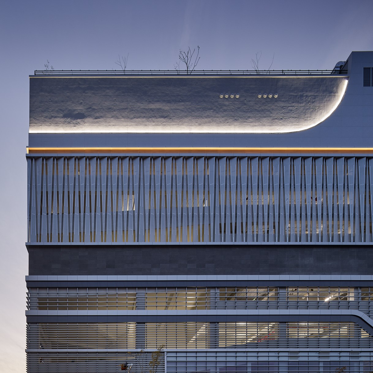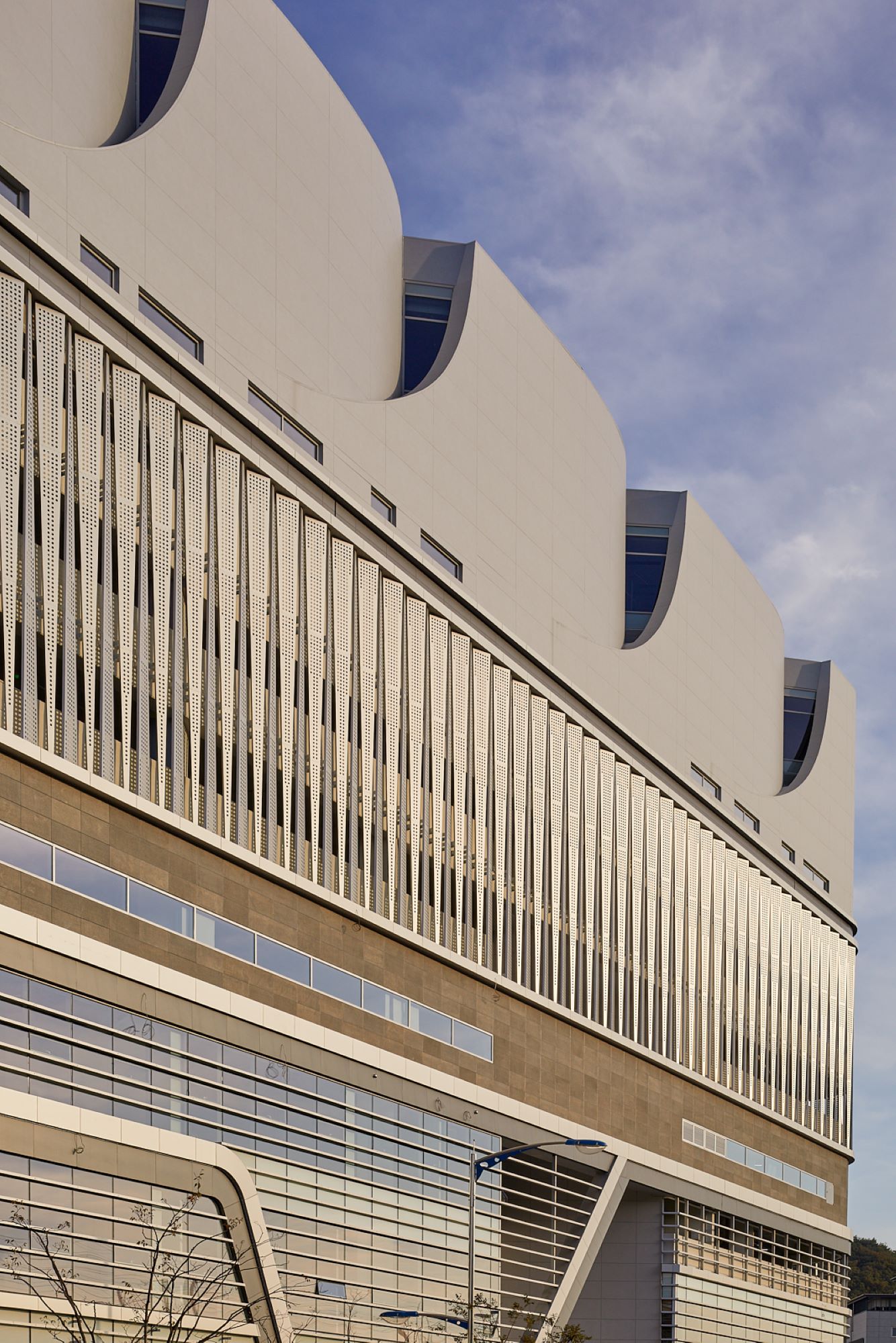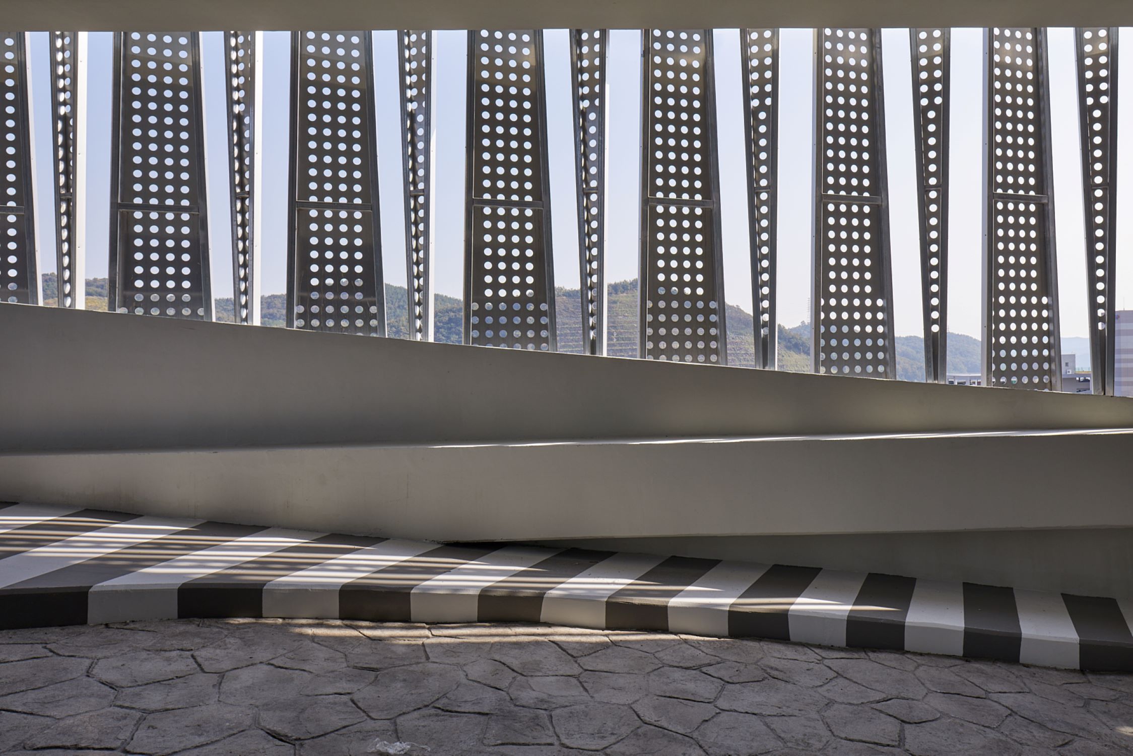 Reckoned as the new hub of Ulsan city, KTX Parking Complex successfully set an example in strategizing commerciality while tackling various urban interventions. The site, located in front of the crowded Ulsan KTX Station, was faced with the juxtaposition of the parking crisis and neighboring commercial districts. The project finds its significance throughout the complexities of fulfilling the parking demands along with numerous compositions of retails and commercials. Hence, the establishment of such commercial axis wrapped in iconic identity proposes a punchline to the design approach. According to Korea build regulation, a parking building should consist of 30% commercial to 70% parking of total gross floor area, respectively. The project, adopting similar terminology, distinguished itself through the composite relationship between the parking and the program, which has been resolved in various ways. The lower levels support public engagements through various commercial amenities while silmutaneously address the demands of basement parking. The top floor is reserved for wedding and convention areas. Complimenting this was the in-between parking (semi-private parking) for visitors attending the event. The programs, strategically stacked vertically, offered flexible distributions of the spatial arrangement, taking account of many characteristics of space. Similarly to its composition, the project adopted identical algorithms to its facade. Glass facades with aluminum lovers are applied to lower section frontage, interpreting the speed of KTX. The semi-private parking is enclosed transparently with perforated aluminum panels adjoined at a customized angle, projecting an interplay between day and night. Not to mention the top event space formed with curved aluminum composite panel symbolizing the curvature of the wave of Ulsan sea, silmutaneously the tulip flower that represents wedding Subsequently, this compound strategy flows back to the architectural concept of a hub and transit gateway.