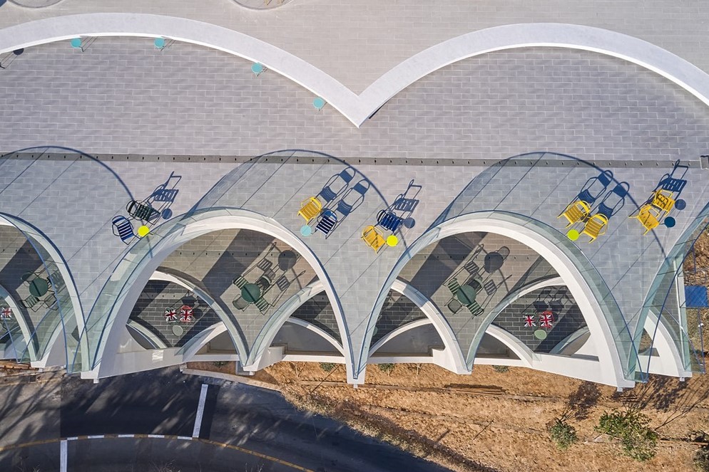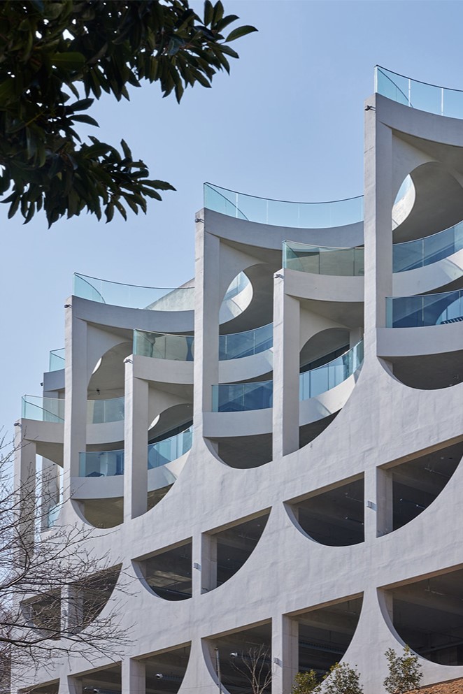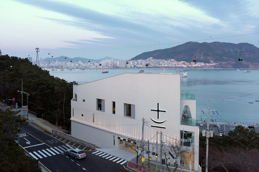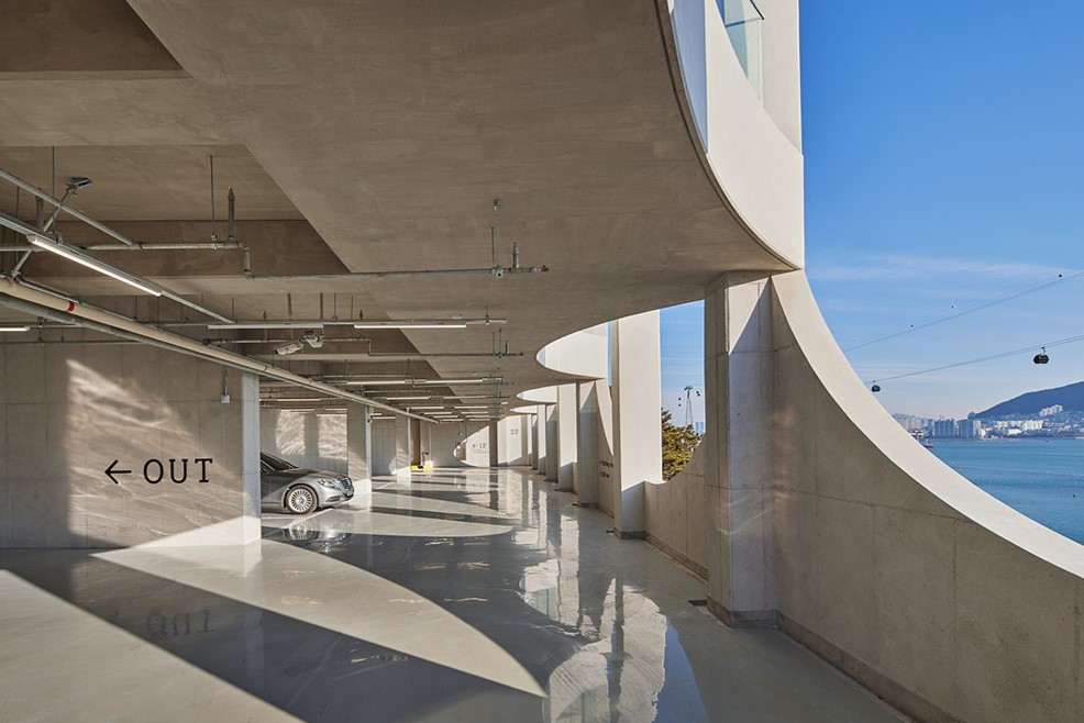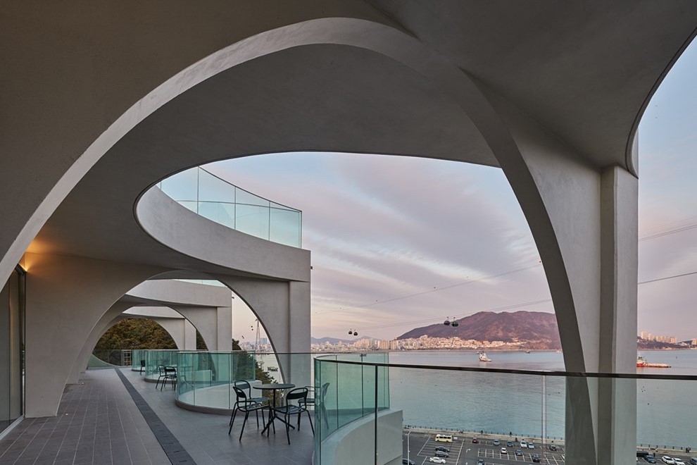 EL 16.52 coffee shop has opened near Songdo Beach in Busan, South Korea, with a beautiful view of the South Sea. EL stands for elevation above sea level, and the cafe's name, EL 16.52, refers to 16.52 meters, which is the elevation of the first floor of the cafe building. The cafe is located in the middle of Amnam Park, a region of lush forests and sheer cliffs. Amnam Park is a national natural park composed of sedimentary rocks formed over a billion years ago, and is an essential space for Busan citizens to enjoy the natural environment. The café building was designed to fully appreciate the topographical features and the colorful charms of the sea and land. Experimental lines, organic shapes, and eye-catching semicircular arches are balanced to add a dynamic force to the overall building design.